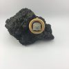 Le moulage en béton brut de l’avant d’un combi a été ensuite vernis pour plus de solidité. Il a été monté sur un support à cabochon en acier inox en métal argenté (garanti sans nickel, sans cadmium et sans plomb) qui a été recouvert au préalable d’un papier vernis au motif année « 70 ». Un anneau en bois vintage datant des années 1950 fabriqué en France dans le Jura a été fixé sur le pourtour du support à cabochon afin mettre en valeur le combi .