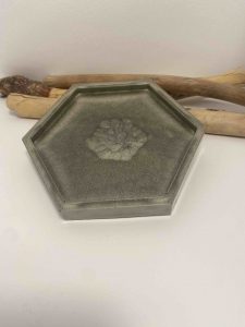 Vide poche hexagonal de couleur beige nacré. Ses dimensions sont 11,5X10cm.